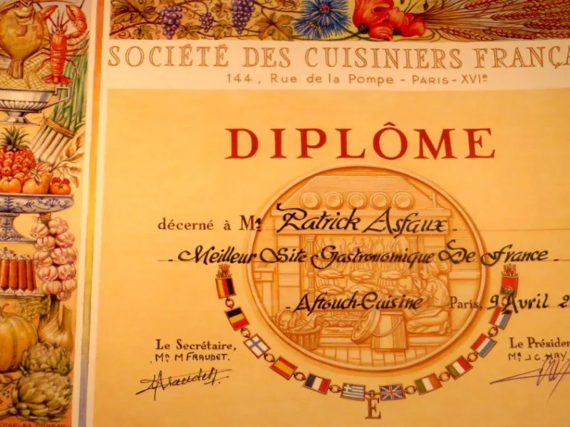 De jolies médailles et diplômes remis aux amis par jean claude Hay notre président a Jacques Delfontaine et Carlos Marsal et cerise sur le gâteau un diplôme me récompensant au titre de « Meilleur site culinaire de France » le 2eme titre de l'année après celui le dernier remis par l'Académie Nationale de France au Sirha cette année .