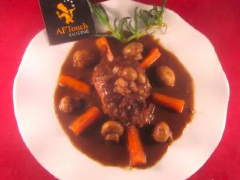7 To plate, remove the strings from your ballotins then place them in the center of the plate coat with sauce and quickly arrange the garnish (carrots and mushrooms alternating with the rest of the sauce on the side.