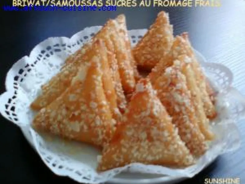 Mix the cheese well with the eggs and orange blossom water, spread the brick sheets, cut rectangles, brush with a little melted butter, Place a tablespoon of filling on the lower half of the rectangle and make a cone shape, then fold twice so as to trap the filling in a triangle of dough. Seal the end with the water and flour mixture. Fry in a hot oil bath, drain on absorbent paper, dip in the previously prepared syrup and garnish with sliced almonds.