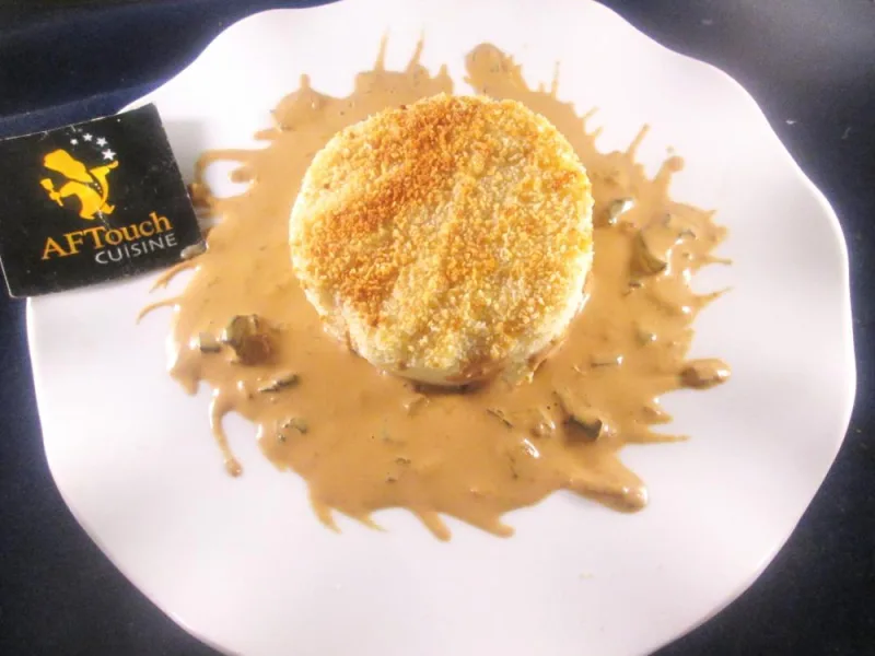 In an oven-safe dish, place a layer of purée, your rabbit capilotade, cover with purée, sprinkle with your breadcrumbs and pass under the grill.