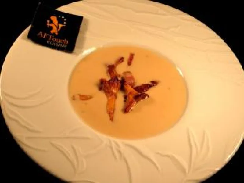 4 In this casserole, sweat your white beans for 4 minutes, add the cream, let it reduce by half then pour in your poultry stock, cook for 5 minutes, then blend well while adding your monkfish livers (or foie gras), salt (lightly), pepper and add a grating of nutmeg, you should by insisting get a smooth and tasty cream, test the seasoning and add small dice of cold raw butter and mix.
