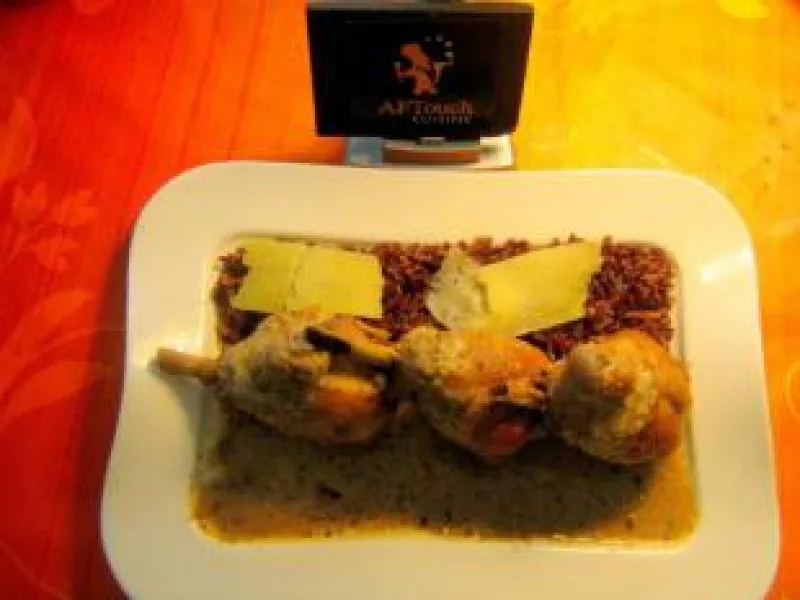 Sur de jolies assiettes bien chaudes vos 2 pilons de volaille d'une part et sur le côté vos lentilles rouges surmontées de copeaux de Cantal.
