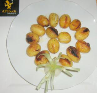 4 Take a fine knife, make a small slit in each potato and insert a slice of garlic into each one.