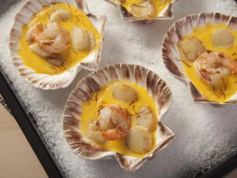 5 place scallops and shrimp in each plate and cover with sauce.