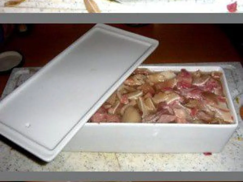 7 On your work surface peel your tongue, remove the bones from the feet (they come away easily) trim a little of the fat from the ears then cut everything into large pieces of 2 to 3 cm well mixed.