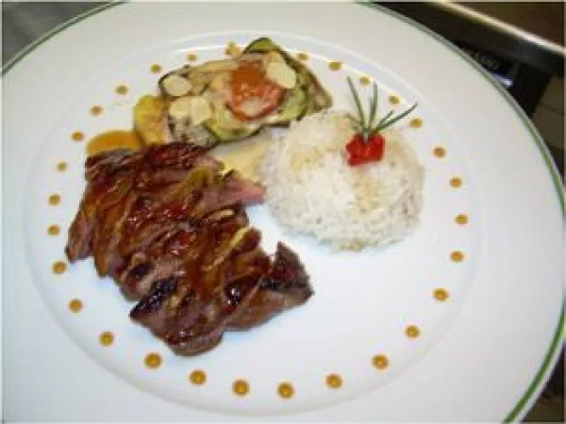 recette imaginée en fonction des régions d'ou étaient originaires les 3 candidats la Réunion pour la jeune fille la Savoie et la Normandie pour les garçons recette proposée et appréciée du jury filet de canette marinée ,planchée et laquée contisée de tranches de pommes fruits polenta mouillée au bouillon thaï avec dés de shiitake