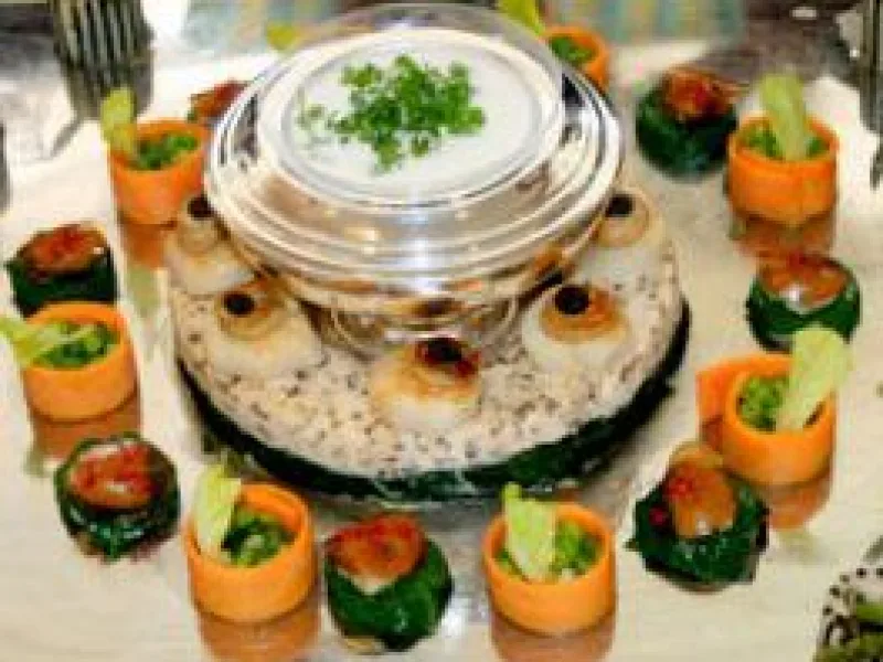 Savarin de St Jacques, morilles et fenouil sauce coques royales d'huîtres a la gelée de cidre, cromesquis d'escargots et st jacques à la Rossini.