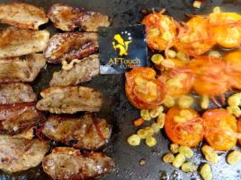 4- Voilà vos invités ont presque terminés leurs entrées, alors allumez votre plancha en position 4, d'un côté posez vos abricots côté face cuire 3 minutes puis remettre cavités en haut garnissez les de vos raisins macérés et surmontez d'un peu de chiffonnade de Bayonne.