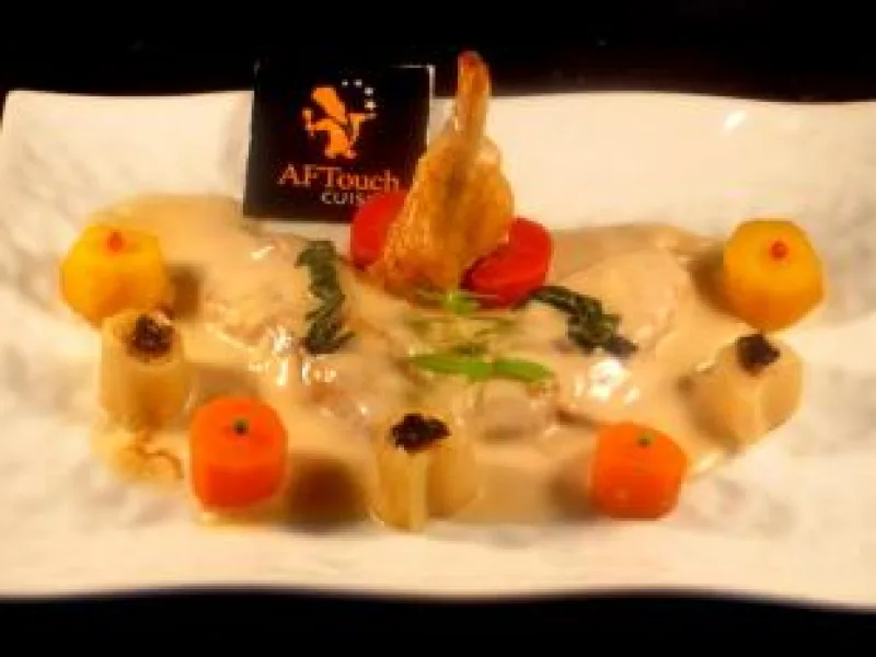 10- Voilà maintenant dressez avec goût sur vos assiettes bien chaudes les ailerons votre garniture autour un peu de truffes (si vous avez) sur les rondins de poireaux puis nappez vos ailerons d'un peu de sauce bouillante le reste servi en saucière a part.