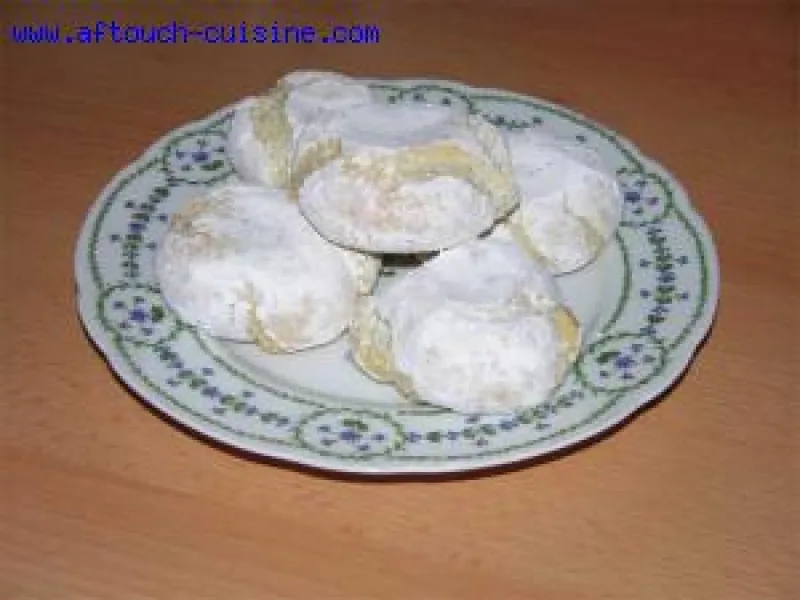3- rouler les boules dans le sucre glace, les placer sur une plaque avec papier sulfurisé. aplatir de suite les boules avec le dos d'une c. à soupe propre et sèche.