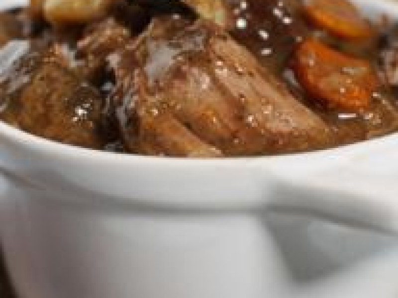 1- Choisissez une marmite allant au four (le creuset par exemple) puis installez-la sur le feu avec un peu d'huile (ou graisse d'oie) versez vos morceaux de viande et faites les bien revenir afin qu'ils soient bien rôtis sur toutes les faces, puis ajoutez la mirepoix de carottes et d'oignons, les gousses d'ail écrasées, le bouquet garni et laissez suer doucement à couvert pendant 10 minutes.