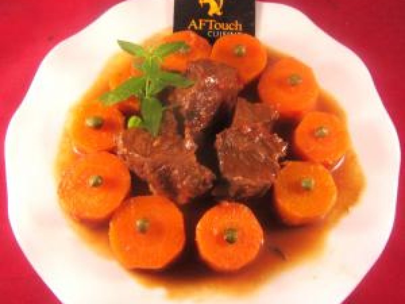Dressez votre bœuf carottes avec goût sur des assiettes chaudes, les carottes autour avec une petite câpre au centre.