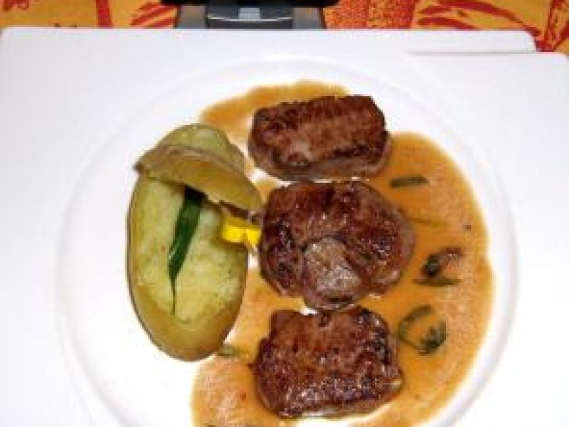 Sur de jolie assiettes chaudes, présentez harmonieusement vos pommes farcies et vos 3 bouchons, un cordon de sauce autour le reste en saucière.