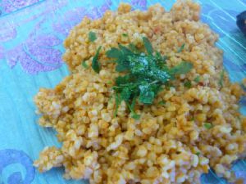 6- Verser ensuite le boulgour, et bien mélanger l'ensemble, pour en imprégner le boulgour.