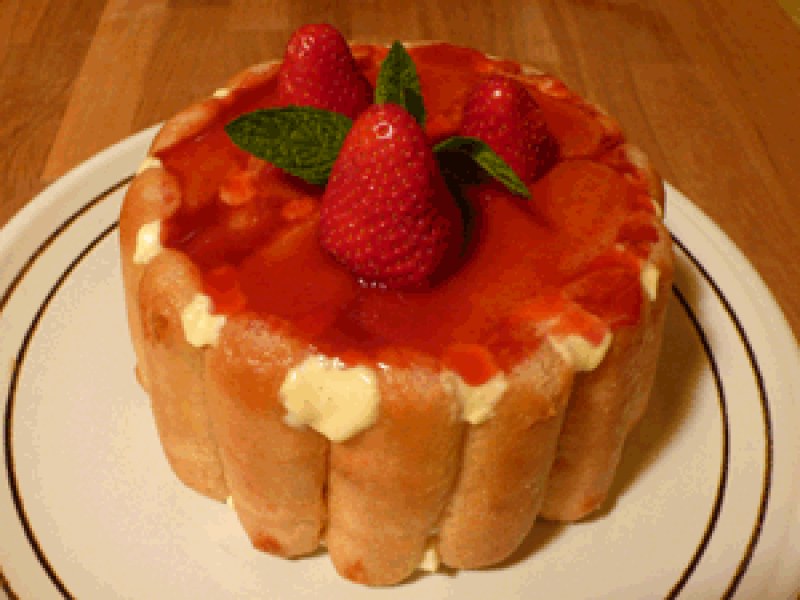 plonger le moule dans de l'eau chaude une quinzaine de secondes, l'essuyer et le retourner sur un plat de présentation pour démouler la charlotte. napper avec 1 belle càs de coulis de fraise bien froid, décorer avec les quelques fraises réservées et un toupet de menthe fraîche.