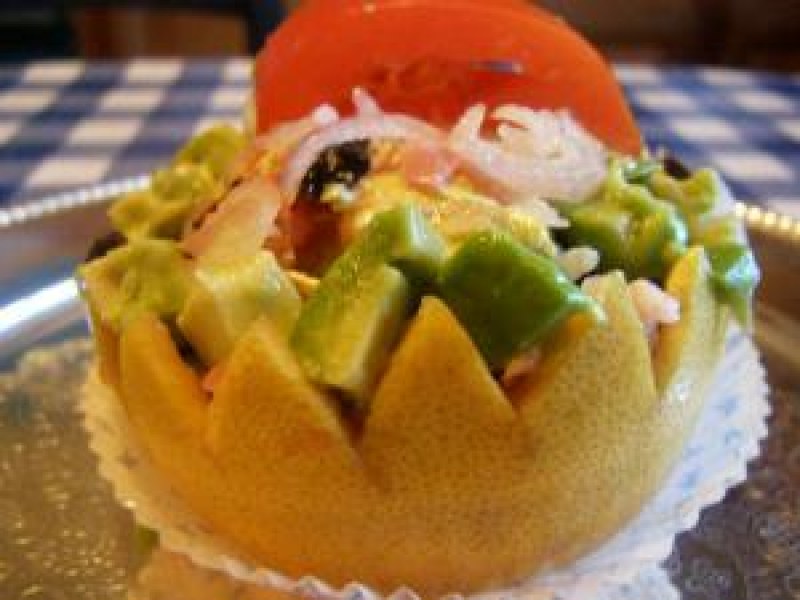 4Remplir les enveloppes de pamplemousse avec les dés d'avocats, les tranches de pamplemousse, les crevettes le jambon. Napper de sauce et garnir avec les olives noires dénoyautées et coupées en lamelles et les échalotes. Ajouter éventuellement une tranche de tomate.