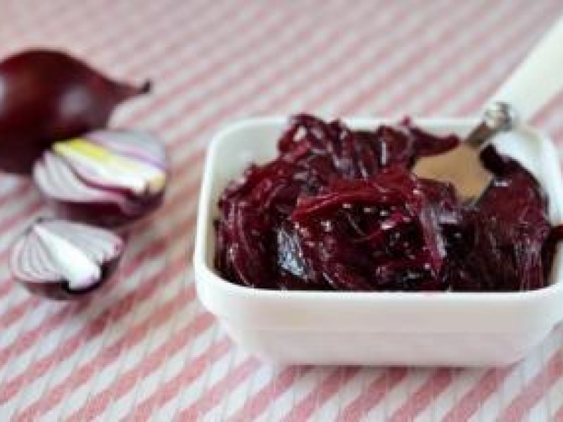 Sur chaque jolie assiette chaude, une côte de porc au centre puis ajouter sur le dessus une grosse cuiller d'oignons rouges surmontée d'un des oignons nouveaux cuits.