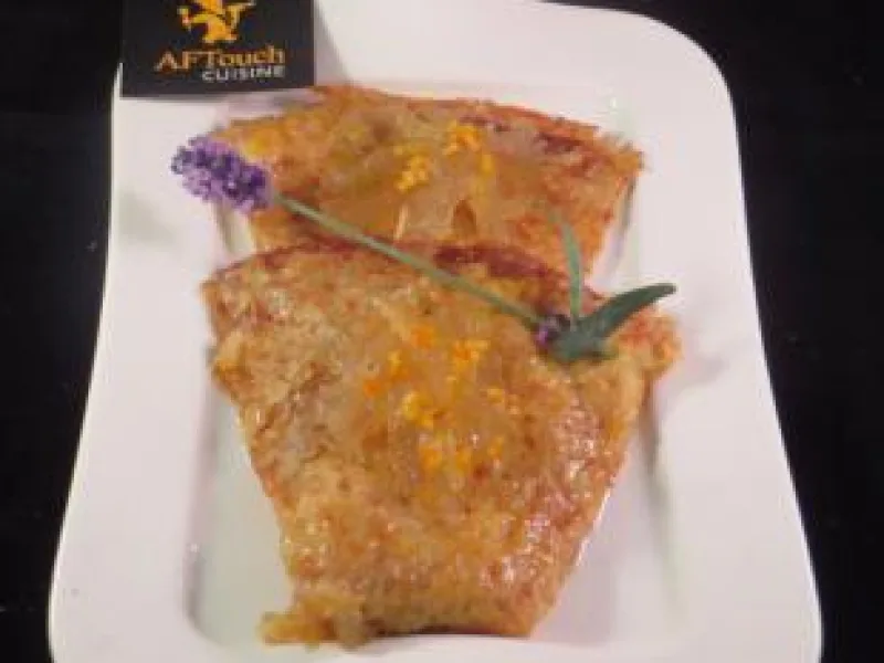 4- Dans une poêle mettez a fondre un peu de votre beurre de mandarine puis une a une posez une crêpe tartinez d'un peu de confiture de cédrat et pliez en 4 faites ainsi jusqu'à la fin de vos crêpes .