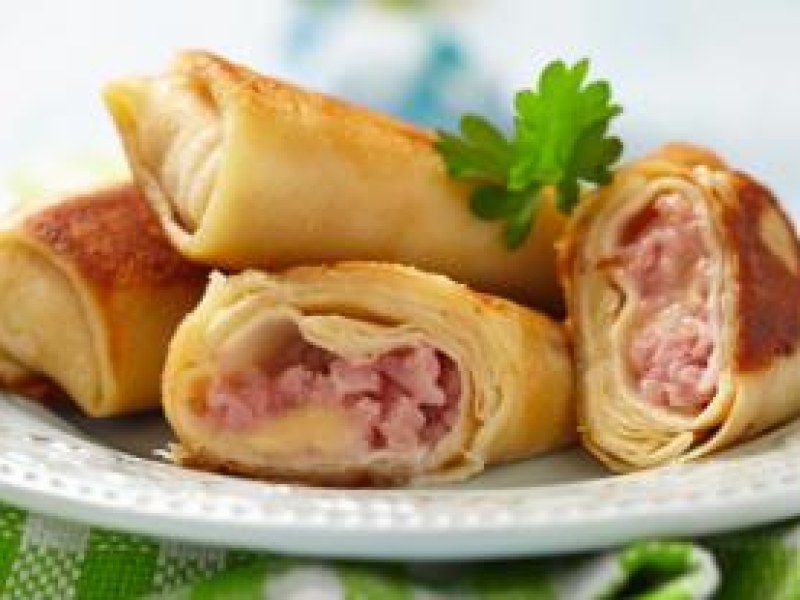 2- Installez une à une vos crêpes sur votre plan de travail, au centre mettez une cuiller de Mornay (béchamel au fromage) puis quelques dés de jambon et recouvrez d'un peu de Mornay.