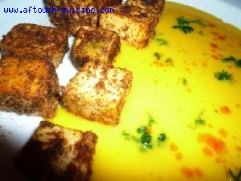 présenter le velouté dans une assiette et immerger les carrés de tofu dans le velouté. vous pouvez ajouter une timbale de riz à proximité