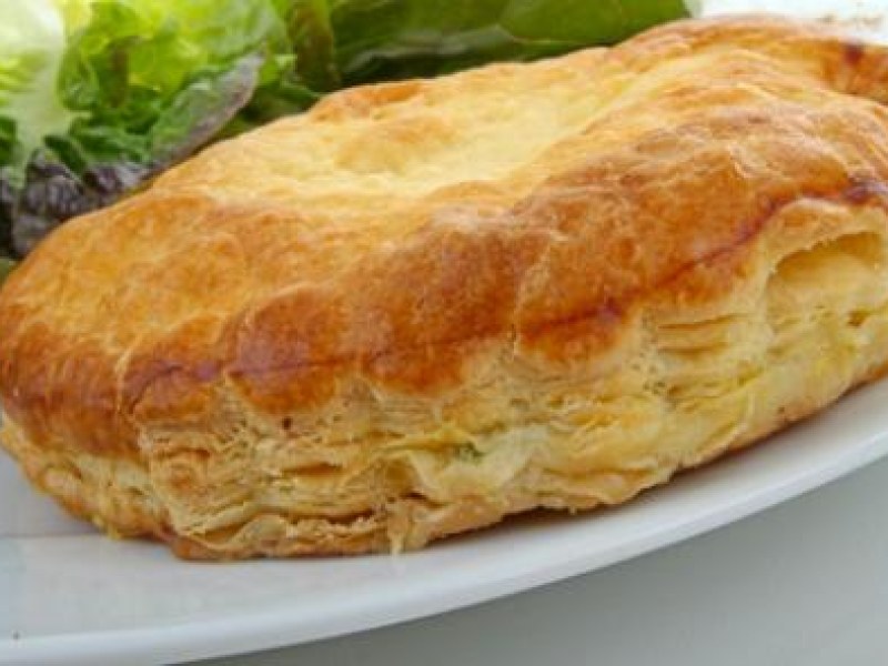 8- Servir les tranches de feuilleté, arrosées de la sauce au basilic.