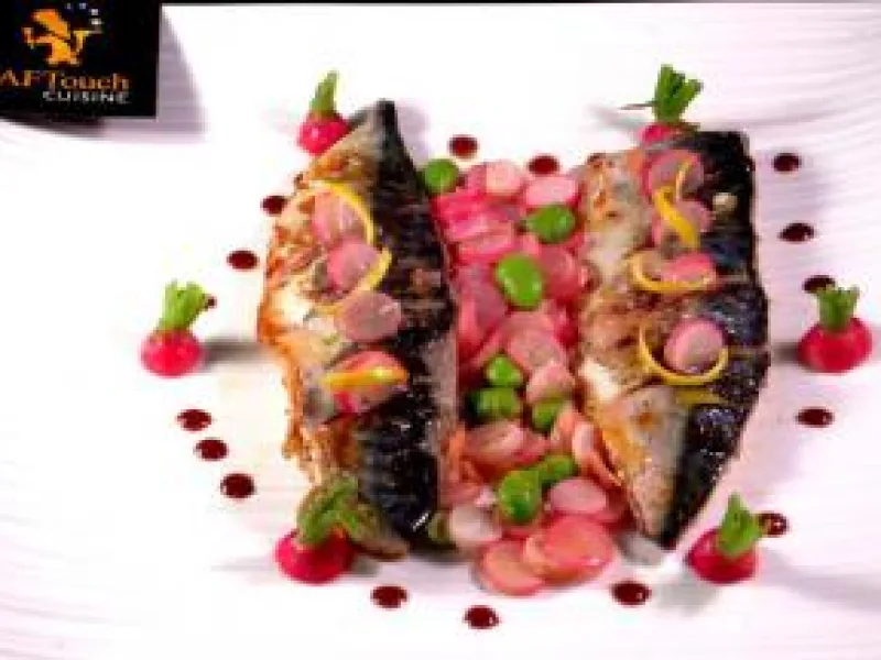 Faites chauffer vos 2 poêles dressez vos filets tête-bêche sur chaque assiette chaude installez les radis roses au centre faites chauffer un beurre dans la poêle de cuisson des poissons ajoutez jus de citron ou vinaigre de riz et versez bouillant sur vos filets et décorez rapidement avec la sauce soja.