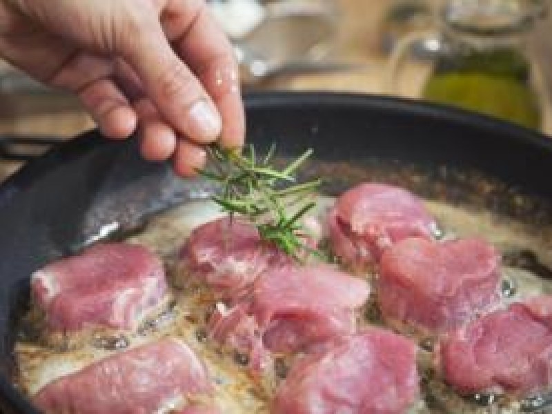 4- Pendant ce temps, prenez une cocotte (style le creuset), mettez un peu d'huile d'olives et de beurre puis lorsque l'ensemble sera meunière, déposez vos grenadins de porc ou de veau assaisonnés (sel et poivre) et cuisez-les doucement huit minutes de chaque de côté.