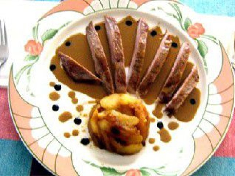 Puis sur vos assiettes chaudes démoulez vos demi globes de pommes, les aiguillettes dressées en éventail et un peu de sauce entre chaque tranche.