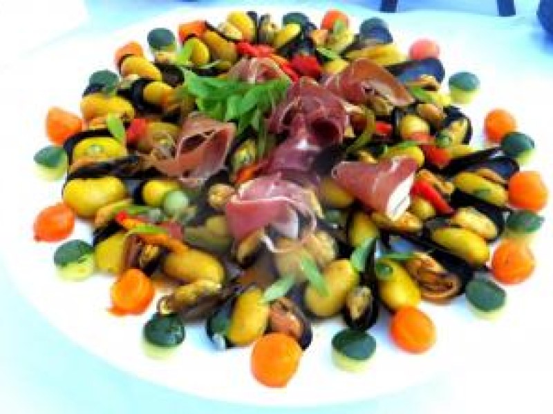 5- Présentation : Servez bien chaud dans un plat creux surmonté avec les lanières de Jambon de Bayonne et quelques coques de moules autour pour la déco.