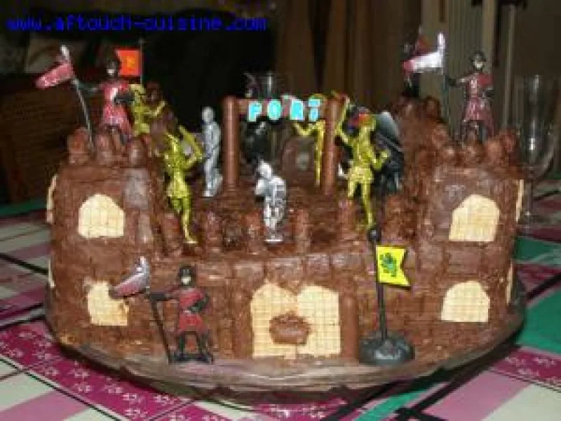 5/ Coupez les gaufrettes pour représenter les fenêtres et la porte. Coupez le petit bout de chaque bâtonnet au chocolat et disposez-les sur les tours et tout autour du gâteau. Faites-les adhérer avec la crème au beurre. Disposez les Playmobils: drapeaux, soldats, etc