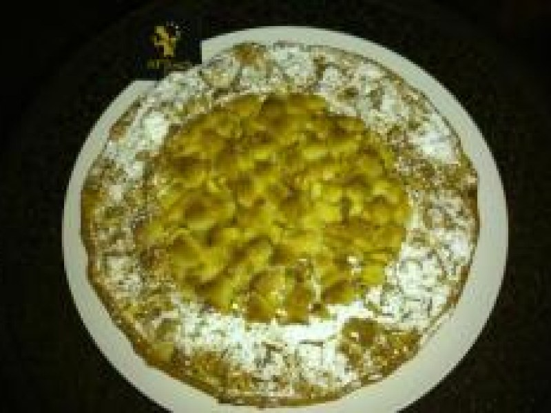 5- Sur votre plan de travail, posez votre tarte puis étalez y votre crème d'amandes, égouttez vos dés de pommes et disposez les dessus, puis sortez votre strussel et taillez dedans rapidement de petits dés d'1cm environ que vous éparpillerez sur le dessus de votre tarte.