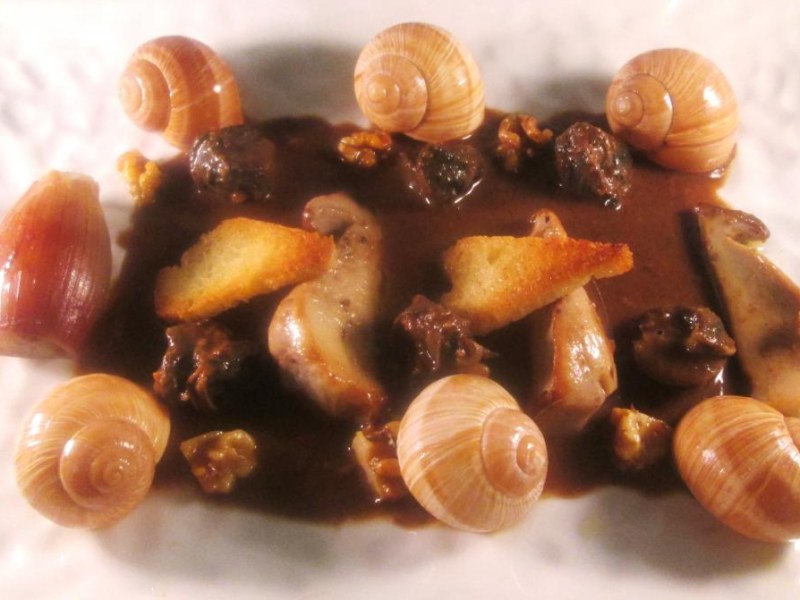 Dressage: Sur de belles assiettes chaudes dressez vos escargots au centre nappés de votre sauce puis intercalez vos tranches de cèpes et vos 2 croûtons parsemez ensuite avec vos cerneaux de noix.