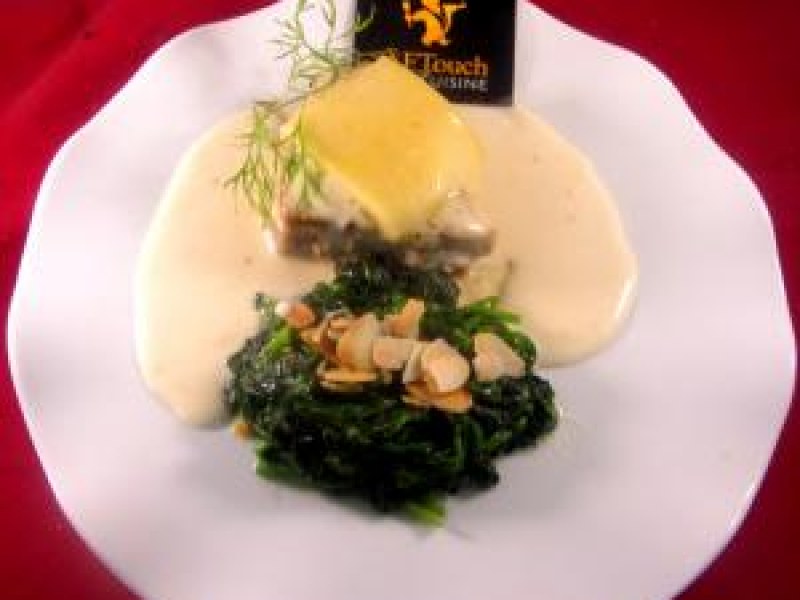 4- Dressez sur des assiettes bien chaudes nappez juste un peu de sauce bouillante (le reste autour) puis installez vos tranchettes de gruyère sur chaque et de l'autre côté les épinards juste un peu égouttés et parsemez les des amandes .
