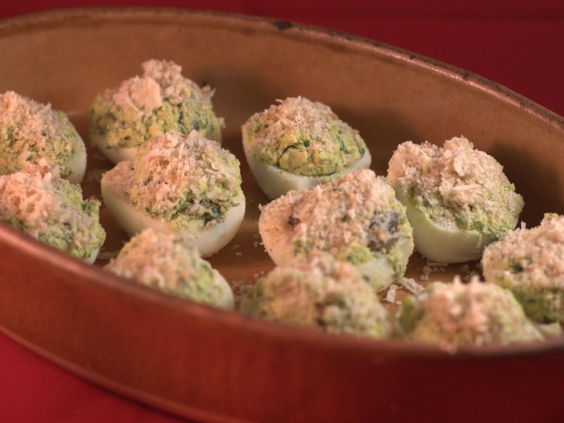 6- Mélangez votre chapelure et le parmesan et déposez en sur chaque 1/2 oeuf et passez votre plat au four en position gril 6 a 8 minutes.