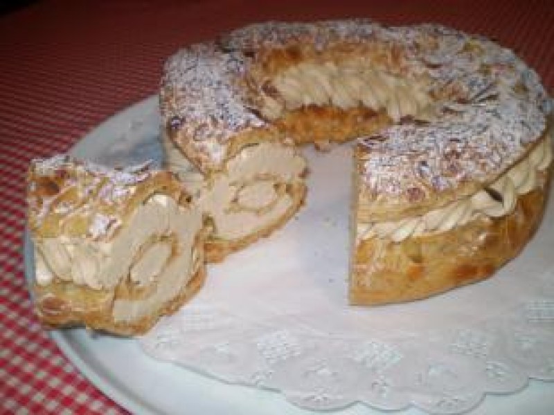 11- Posez à plat le fond de la grande couronne et couchez à la poche une couche de crème puis posez la 2ᵉ couronne fourrée, une autre couche de crème et enfin, posez délicatement le grand couvercle. Saupoudrez de sucre glace et rentrez-le au frigo pour qu'il soit bien froid à sa dégustation.
