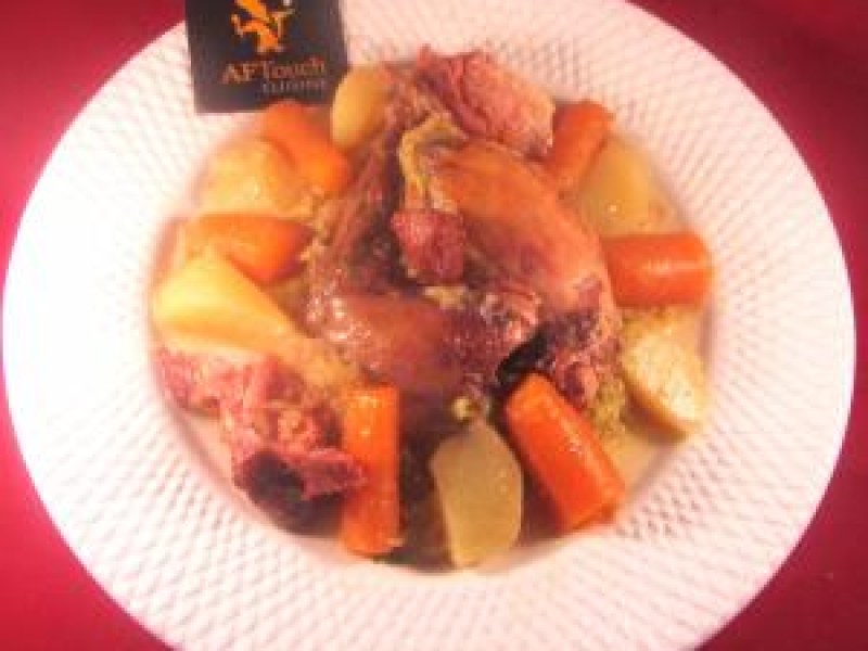 5- Sur le feu mouillez a hauteur (eau ou bouillon) puis a l'ébullition, couvrez et installez au four pour 4 heures au bout de ce temps étéignez le four et laissez reposer.