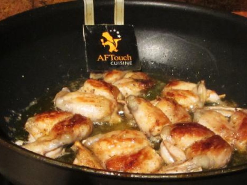 1- Dans une sauteuse, faites fondre 25 g de beurre puis ajoutez les échalotes ciselées et les cuisses de grenouilles salez et poivrez. laissez suer à couvert doucement pendant 5 à 6 minutes.