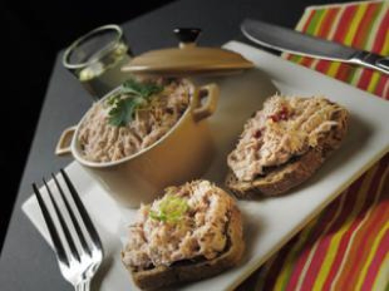 La spécificité de ces rillettes tient au fait que la viande est tout d'abord saisie, ce qui lui donnera ensuite cette couleur si particulière.