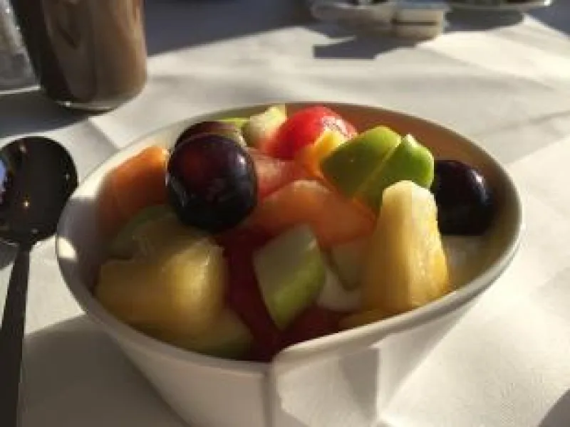 2/ le lendemain passer-le à la passoire fine, et y ajouter les fruits de votre préférence coupés en gros quartiers, laisser mariner pendant 3 heures avant de deguster, servir bien frais dans des coupes, décorer avec des feuilles de menthe des quartiers d'oranges. hummm c'est très rafraichissant