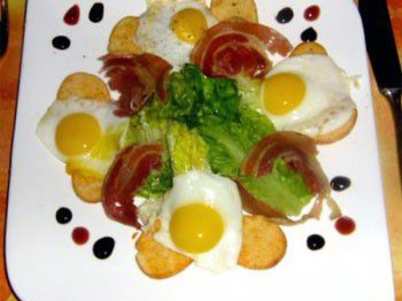 5- Il ne vous restera plus que de faire de jolis ronds a l'emporte pièce(ou avec un verre) autour de vos œufs au plat et avec l'aide d'une spatule en fer de les placer harmonieusement autour de l'assiette rajouter les pétales de pancetta tiédies bien sèches et quelques gouttes de crème de balsamique autour.